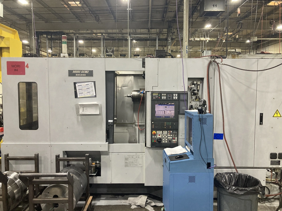 MORI SEIKI NH5000/50 CNC Horizontal Machining Center, model year 2004. Key specs: X 25.6", Y 27.6", Z 28.7", 40 hp, 8,000 RPM, 60 ATC, CAT50 taper, 19.7"x19.7" pallet. Available now.
