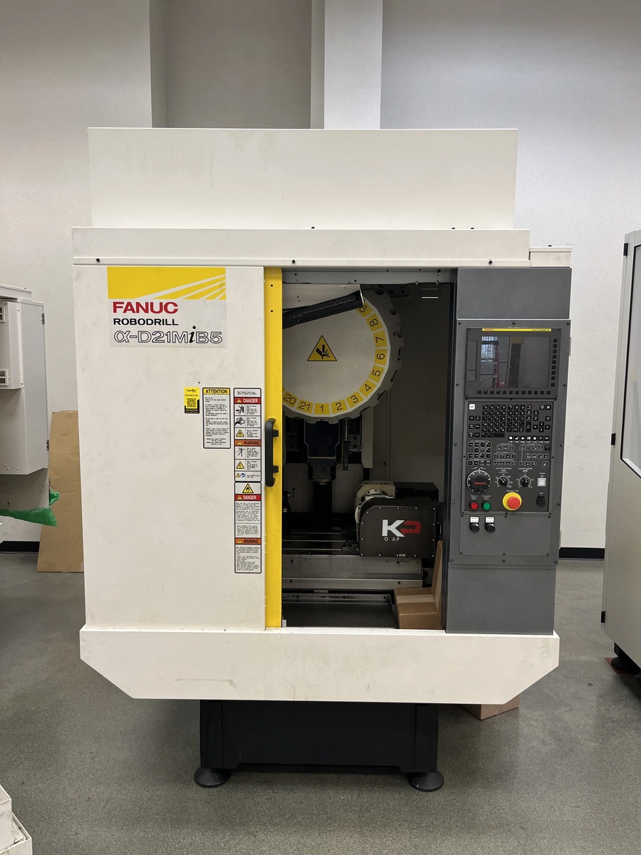 FANUC ROBODRILL ALPHA D21MIB5, CNC Drilling & Tapping Center from 2021. Equipped with Fanuc 31i_B5 Control, 10,000 RPM Direct Drive High Torque Spindle, Tsudakoma TWA-130 5th Axis Rotary, Renishaw RTS TS27R Probe, AutoDoor, and Robot Interface 2.