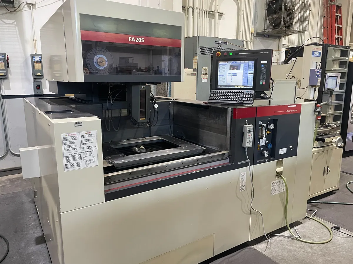 MITSUBISHI FA-20S Advanced Wire EDM, 2007 model, used condition. Specs include 13.8"x19.7" machining stroke, max workpiece weight 3,300 lbs, 200-220V electric reqs. Features Mitsubishi M750 CNC, submerged machining, auto wire threader, and more.